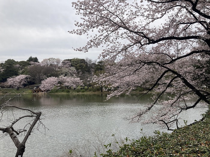 池の周りを歩くと、水面にせり出す桜の枝が織りなす景色が広がります。