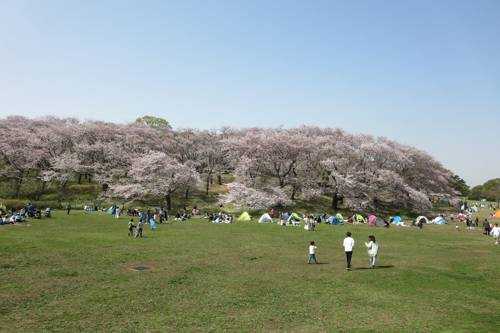 広い芝生の上では、家族連れがレジャーシートを広げて思い思いに過ごしており、ゆったりとした時間が流れています。