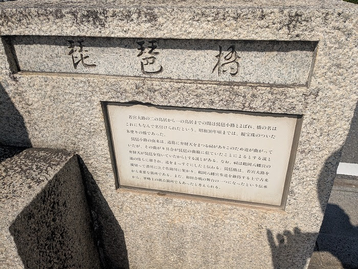 琵琶橋の名は、若宮大路のこの辺りがかつて琵琶小路(びわこうじ)と呼ばれていたことに由来します。なぜ琵琶小路と呼ばれたかについては、道筋が琵琶の形に似ていた、あるいは琵琶を弾く盲人が住んでいたなど、いくつかの説があります。