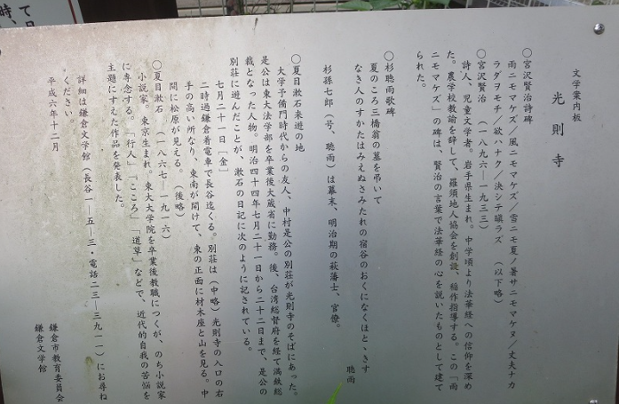 文学案内板には、夏目漱石が光則寺近くに別荘を持つ友人の中村是公を訪ねた際のことが書いてあります。